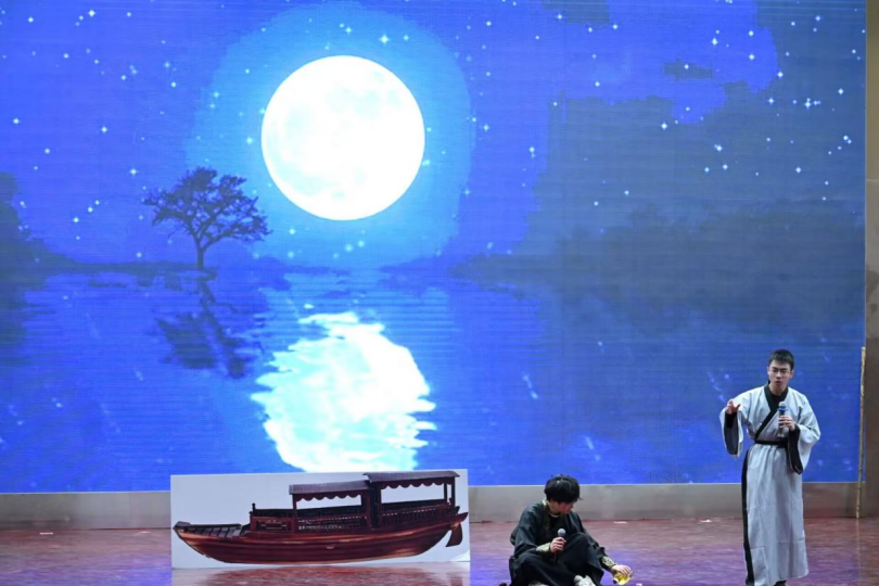 话剧《江海寄余生》以苏轼的人生经历为灵感,讲述了他在人生起伏中寻求意义的故事,通过苏轼的经历,传递了对人生意义的深刻追求。这场独出心裁的话剧表演宛如一颗璀璨星辰,照亮了同学们的内心世界,让同学们得以跨越时空,与先贤苏轼进行一场心灵对话。话剧以苏轼在元丰三年因乌台诗案被贬黄州的经历为蓝本。彼时,曾经意气风发、才情横溢的苏轼,瞬间从朝堂高位跌落至命运的谷底,一时间心志皆失。然而,在黄州的四年零三个月里,他经历了人生最重要的转折,在梦醒皆空后开始了对当下人生意义的执着探寻。“吾辈的生命,仿若这赤壁的江水,即便终将逝去,但每一刻都弥足珍贵,都刻骨铭心”。话剧生动展现了苏轼在黄州期间的生活片段,在赤壁之下泛舟,与友人对饮,观众仿若跟随苏轼一同经历这心灵的蜕变历程,沉浸其中,反思自己的人生旅程,思考如何在纷繁复杂的世界中找寻属于自己的价值与意义,领悟到无论遭遇何种挫折与磨难,都应珍视当下,积极探索生命的真谛。