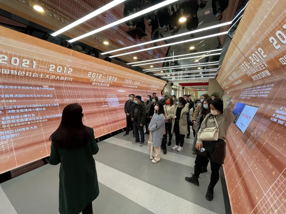 党员教师们一走进党群服务中心,就被眼前那充满未来感的“时光隧道”所吸引。在讲解员的引领下,党员老师们通过这条特别的通道,共同体验了全新的党史教育主题展厅。大家认真聆听了中国共产党的奋斗历史,回顾了马鞍山市党建工作的光辉历程,深刻体会了中国特色社会主义道路的来之不易。从1958年毛主席视察马钢,到2020年8月19日习近平总书记亲临马鞍山市的不解情缘中,大家感受到了党对马鞍山市无尽的关心与爱护。