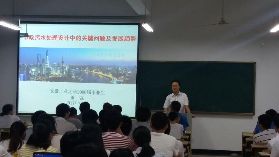 2008届优秀毕业生、上海市政设计研究总院校友董磊在建工南楼511为给排水科学与工程专业的师生做了题为“市政污水处理设计中的关键问题及发展趋势”的学术报告。市政工程系部分老师、硕士研究生及13、14级本科生参加了报告会。