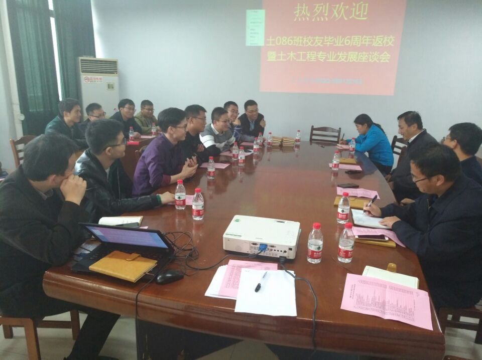 土木2008级6班校友毕业返校座谈会在学院317会议室举行。追忆同窗旧事,畅谈人生感悟,展望美好未来。院副书记副院长赵龙,副院长钱付平、陈德鹏,土木工程系黄伟教授、系主任曹现雷、系教工党支部书记王学庆及刘纯林、孔正义等多名教师参与了此次座谈会。会议由赵龙主持。